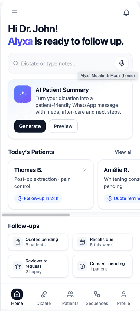 Tap the mic once. As you treat, Alyxa records the consult (with consent), extracts the key facts, and auto-writes the patient-friendly summary. No end-of-visit typing—your report is already done.
